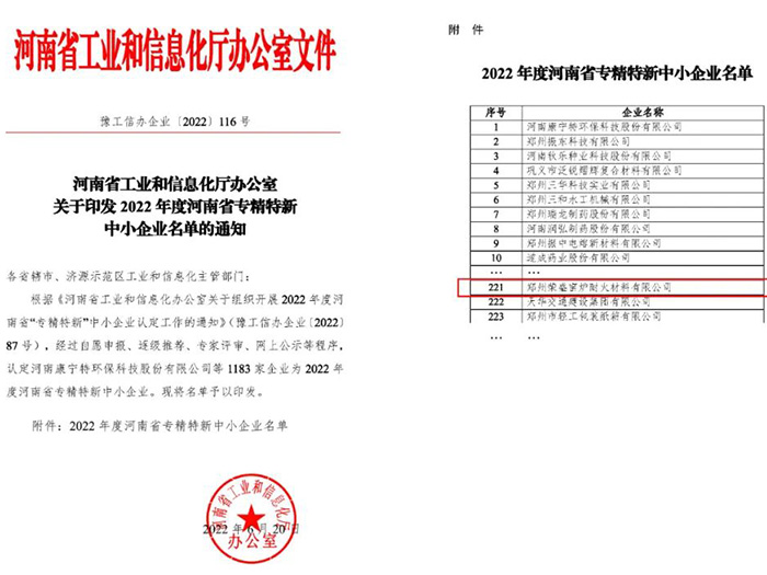喜訊!榮盛耐材被認(rèn)定為河南省“專精特新”企業(yè)~