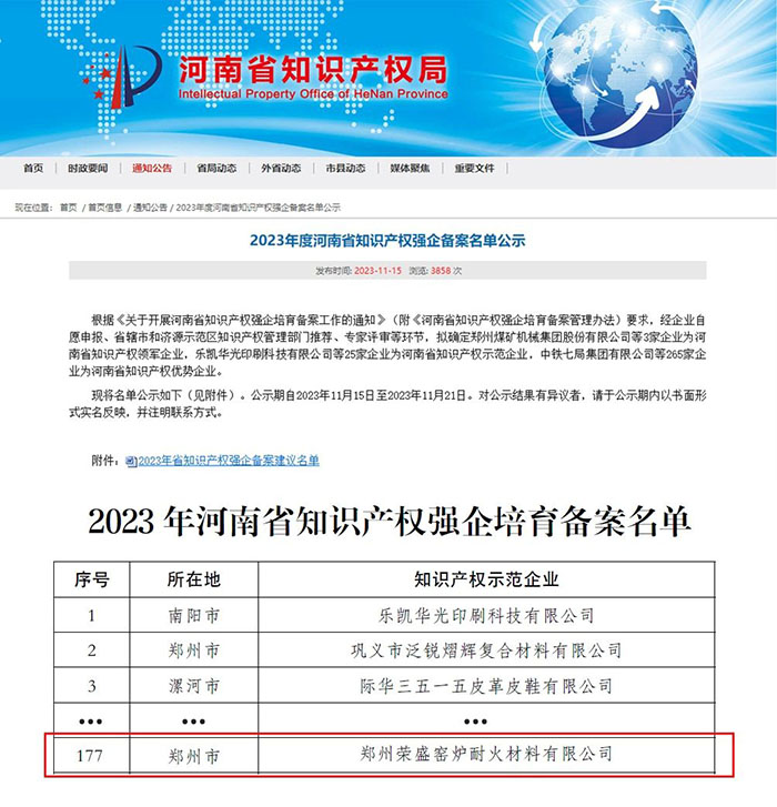 發(fā)布時(shí)間:2023/12/19 16:47:17 點(diǎn)擊率: 來(lái)源:高鋁磚廠家 作者:榮盛耐材近日,河南省知識(shí)產(chǎn)權(quán)局公布2023年度河南省知識(shí)產(chǎn)權(quán)強(qiáng)企備案名單,鄭州榮盛窯爐耐火材料有限公司(以下簡(jiǎn)稱(chēng)「榮盛耐材」)榮獲「知識(shí)產(chǎn)權(quán)優(yōu)勢(shì)企業(yè)」稱(chēng)號(hào),知識(shí)產(chǎn)權(quán)綜合實(shí)力獲官方認(rèn)可。這是今年以來(lái),榮盛耐材在知識(shí)產(chǎn)權(quán)領(lǐng)域獲得的又一項(xiàng)榮譽(yù)。
